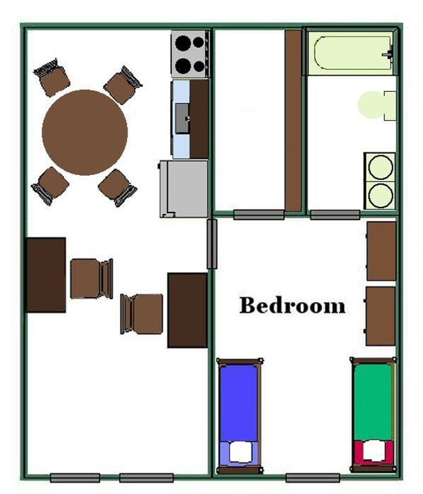 | Furniture | One-bedroom apartment includes — Bed (x2) — Walk-in closet (shared) — Desk with chair (x2) — Chest of drawers (x2) — Desk pedestal with three drawers (x2) — Round table with 4 chairs Efficiency apartment includes — Bed — Built-in standard room closet — Desk with chair — Chest of drawers — Desk pedestal with three drawers |