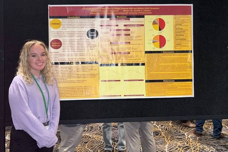 Bloomsburg students Breanna Koslowski (pictured), Avery Priest, and Dr. Jennifer Johnson presented a poster titled “Perceived Meditation Barriers in People with and without ADHD Symptoms.” Their research and presentation were funded through a curricular enhancement grant from the College of Arts, Social Sciences and Humanities.
